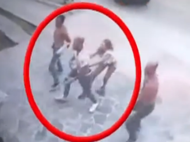 En las imágenes se puede ver cómo un grupo de jóvenes conversa, cuando del edificio aledaño sale una camioneta y, tras un intercambio de palabras, uno de ellos, de polo blanco, tiene una agresiva reacción. Saca algunos objetos del vehículo, los tira al piso, seguridad corre y se arma la gresca.
