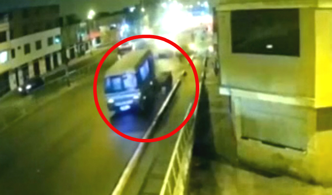 El camión se encontraba estacionado en el carril derecho de la vía y metros atrás se encontraba su rampa de carga. El conductor del vehículo público no se percató de esto y terminó trepando la rampa para luego voltearse en medio de la pista.