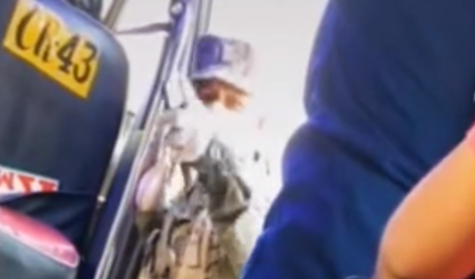 Al ser preguntado por qué llevaba gente parada al interior de su unidad, el irresponsable conductor intentó justificarse y salir del paso. Más aún, los pasajeros del vehículo intentaron respaldar al chofer y presionar al soldado para que los deje continuar su camino.