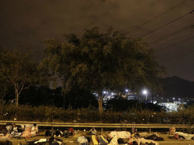 Ante el peligro que representa dormir en la calle y el riesgo de contagio de coronavirus por no respetar la distancia mínima, este numeroso grupo, que acoge a adultos mayores, niños y personas con discapacidad, ha improvisado un campamento sobre el asfalto.