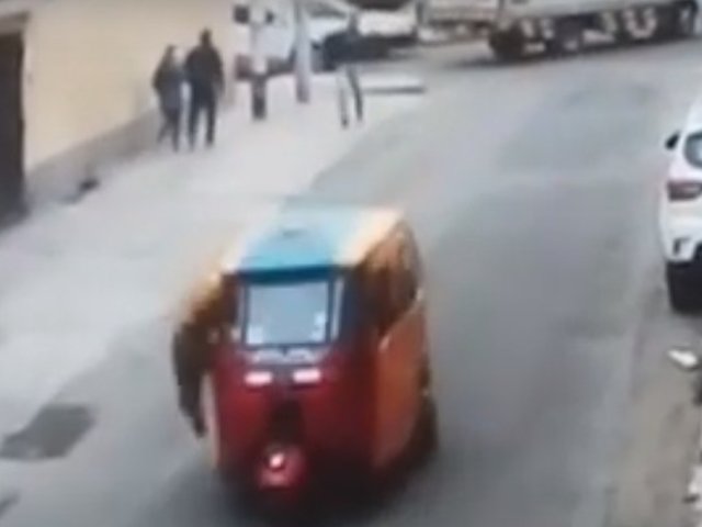 Pues una mototaxi roja se acerca al hombre y de un momento a otro, un ladrón salta del vehículo y le arrancha el teléfono por el cual realizaba una llamada.