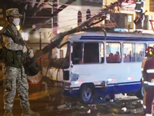 En el distrito de San Juan de Lurigancho, una unidad de transporte público tipo cúster chocó contra unos postes en persecución con policía y personal del Ejército. El fuerte choque sucedió luego que el vehículo se trasladaba en pleno toque de queda. El conductor no quiso pasar por un control militar y policial e intento darse a la fuga.