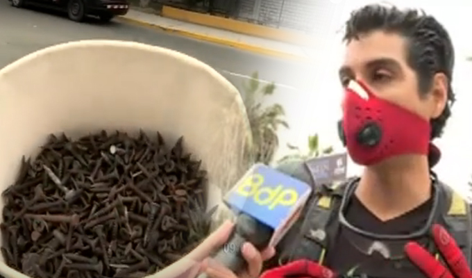 En el distrito de Chorrillos un ciclista identificado como Nelson Morales que recorre la avenida El Sol a diario, ha logrado recolectar cerca de dos kilos de tachuelas, clavos y tornillos en plena pista, en tan solo dos meses.