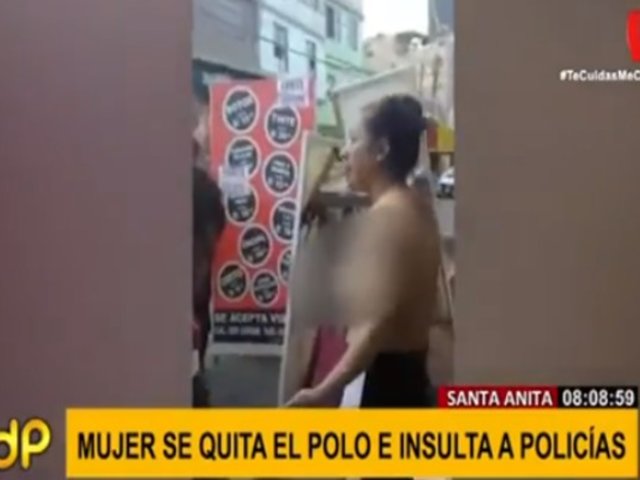 Una mujer fuera de control se quitó el polo para enfrentarse a insultos con efectivos policiales en Santa Anita. Los agentes acudieron hasta la cuadra 2 de la avenida Neruda para intervenir a un presunto delincuente, encontrándose con esta persona.