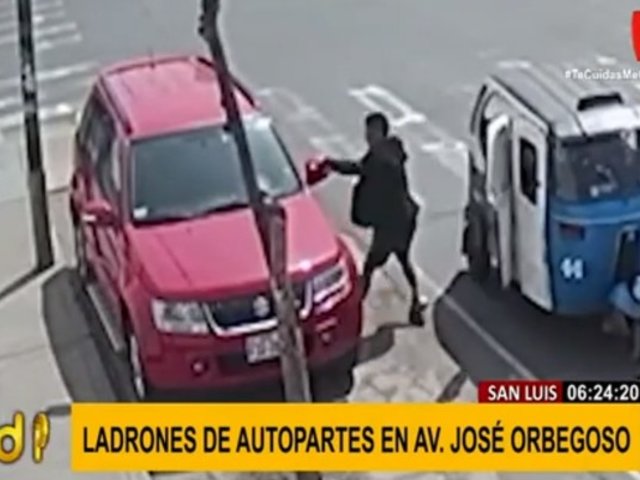 Dos ladrones de autopartes se robaron el espejo de una camioneta en tiempo récord en San Luis. Cámaras de seguridad captaron cómo los sujetos, a bordo de una mototaxi, se detienen y en un segudo arrancan el espejo. Ocurrió en la cuadra tres de la calle José Orbegozo, que se encontraba desolada.