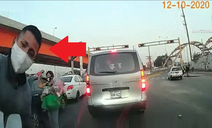 La cámara de seguridad de su vehículo captó al ladrón que se acercó a su unidad para limpiar el parabrisas. Según denuncia, al momento de entregarle el dinero, el sujeto se subió a su vehículo y con un arma de fuego la obligó a que entregue su celular.