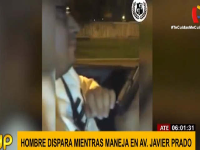 En las imágenes se puede apreciar a un sujeto de entre 35 y 40 años, que trabajaría para una empresa privada, por un fotocheck que cuelga en su espejo retrovisor. Sin pensarlo dos veces, usa su arma y en forma temeraria dispara más de diez veces al aire en plena vía pública.