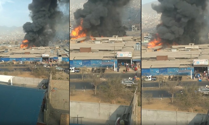 Un gigantesco incendio de grandes proporciones se registra en estos momentos en el centro comercial conocido como “La Cachina”, ubicado en el paradero 12 de la avenida Canto Grande, en el distrito de San Juan de Lurigancho.