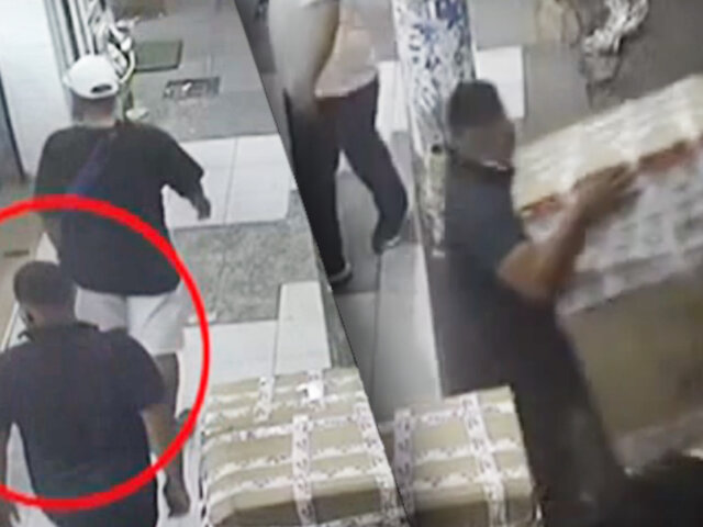 Una cámara de seguridad registró el momento cuando el ladrón se percata del descuido de la comerciante que dejo la pesada caja en la vía pública mientras ella ingreso a una galería.