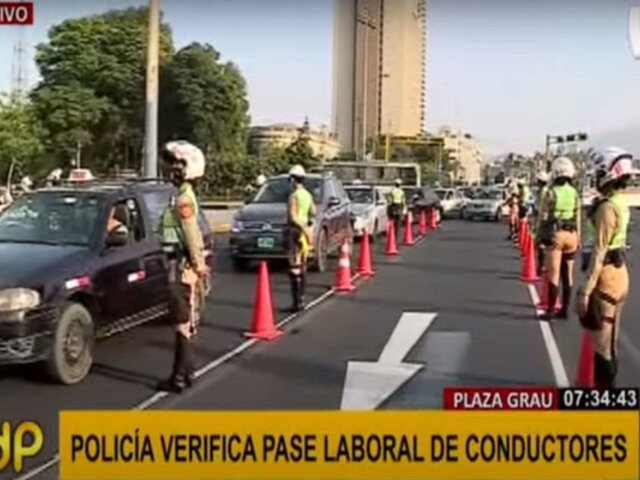 Agentes de la Policía Nacional del Perú (PNP) realizan la mañana de este martes, operativos de control para verificar que los vehículos cuenten con su pase laboral o vehicular en el óvalo de la avenida Grau, en el Cercado de Lima.