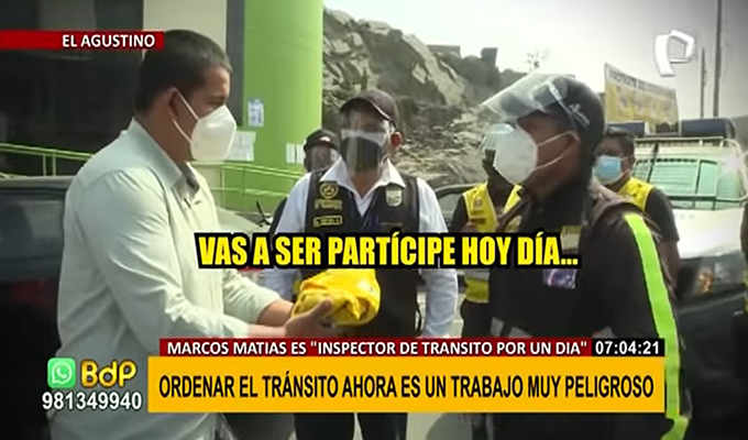 Hace algunos meses la inspectora Jaqueline Rosales Ramírez vivió un terrible momento cuando fue atropellada por un chofer de combi cuando realizaba un operativo vehicular. El accidente le causó heridas que la dejaron internada en una clínica durante un tiempo. Ahora, el reportero Marcos Matías de Buenos Días Perú (BDP) experimentará por un día la labor de inspector de tránsito.