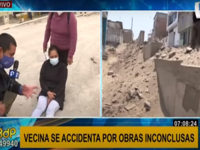 Un equipo de Buenos Días Perú llegó hasta el lugar y fue testigo del riesgo que representa estas obras inconclusas. Una vecina se lesionó el tobillo y quedó tendida en el piso debido a la cantidad de piedras regadas.