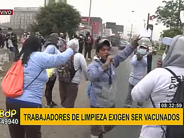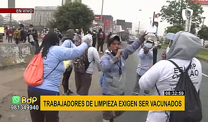 Un grupo de trabajadores de limpieza de la empresa Eslimp Callao se reunieron en los exteriores del aeropuerto internacional Jorge Chávez para exigir que vuelvan a ser incluidos en el proceso de vacunación contra la COVID-19. Según manifestó uno de los trabajadores, pese que en un inicio estaban considerados dentro de los primeros en recibir la vacuna, junto a los bomberos y la policía, repentinamente, ya no lo son. “Cambiaron la regla del juego y, mágicamente, ya no estamos consignados entre los primeros en recibir la vacuna”, indicó.