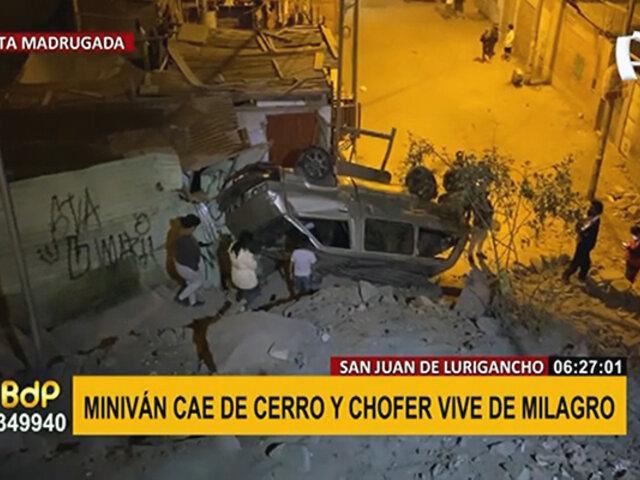 Un miniván se despistó y cayó desde una empinada dando varias vueltas de campana, afectando mayormente a dos casas, hasta que terminó empotrado en una de ellas. Este accidente ocurrió en el asentamiento humano Santa María de San Juan de Lurigancho durante la noche.