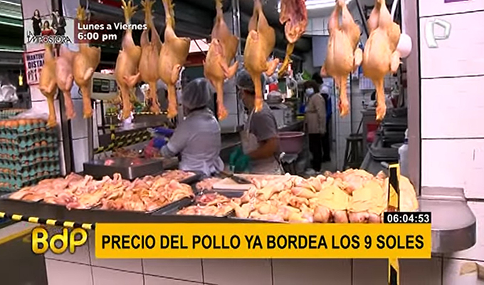 “Estamos acortando nuestro margen para poder vender, porque realmente el pollo está para 9.50, bordeando los 10 soles, pero si lo vendemos a ese precio te quedas con la mercadería”, señaló un comerciante. Al parecer, los insumos importados como el maíz subieron su costo al incrementarse la cotización del dólar.