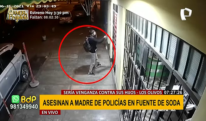 Aurora Bertha Carrasco Salcedo (53), madre de dos policías en actividad, fue asesinada por un sicario con un disparo en el pecho cuando trabajaba en su negocio de fuente de soda. La cámara de seguridad registraron a un sujeto que desde la calle le disparó a la señora y luego huyó a pie rápidamente.