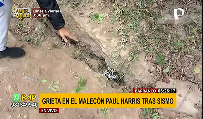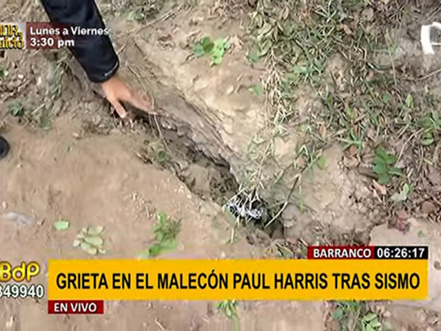 Una grieta de cerca de tres metros de largo se ha reportado en el malecón Paul Harris de Barranco, al costado de la Bajada de Armendáriz y frente a lo que será el parque del Bicentenario, luego de un fuerte sismo registrado el pasado martes 22 de junio, minutos antes de las 10 de la noche.