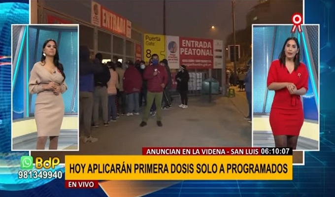 Un equipo de Buenos Días Perú llegó hasta el vacunatario de La Videna, en el distrito de San Luis, en el reinicio de la vacunación contra la covid-19 donde las personas realizan colas desde tempranas horas del día.