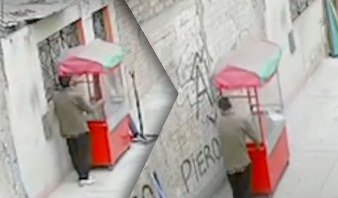 Como registró una cámara de videovigilancia, el ladrón se cercioró que nadie se encontraba en casa y empezó a empujar el puesto de comida rodante y ningún vecino del pasaje pudo percatarse del robo.