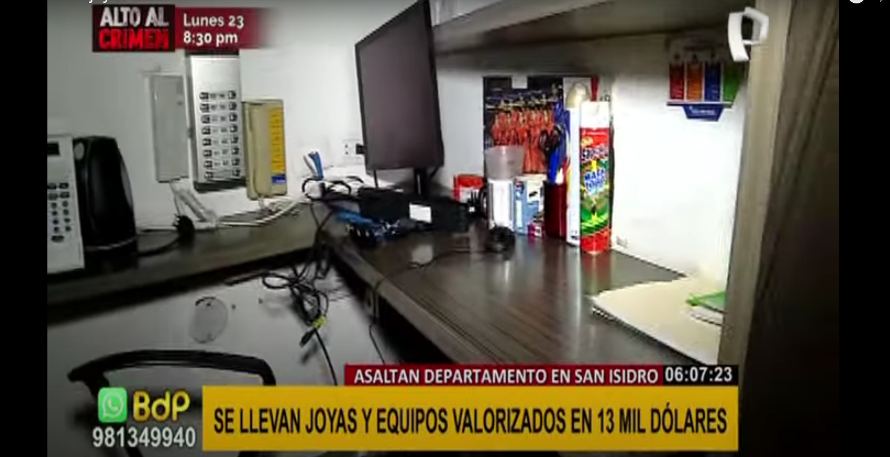 Fue víctima de la delincuencia en su propia casa. Delincuentes se llevaron joyas y equipos valorizados en más de 13 mil soles, del interior de su departamento ubicado en la calle Los Lirios en San Isidro.