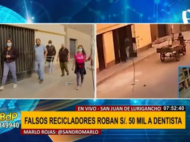 Los delincuentes cada vez se las ingenian para robar en diversos negocios de la capital. Esta vez, sujetos se hicieron pasar como recicladores para llevarse 50 mil soles en un consultorio dental, en San Juan de Lurigancho.