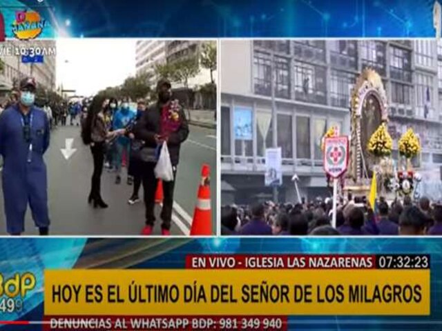 Esta mañana, decenas de fieles del Señor de los Milagros hicieron largas colas en los exteriores del templo Las Nazarenas, en el centro de Lima, en el último día de visitas al anda del Cristo Moreno.