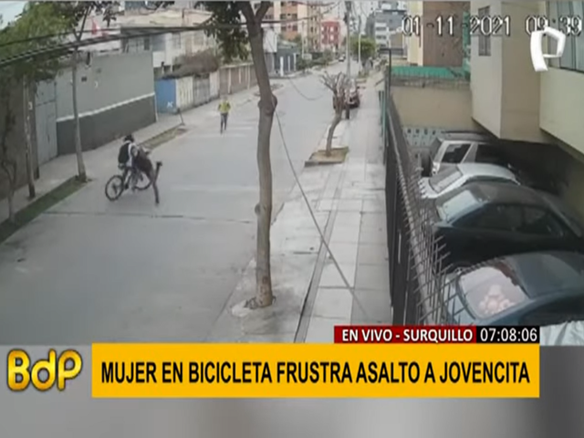 Una ciclista frustró un asalto a una joven en el jirón Narciso de la Colina en el distrito de Surquillo. El ladrón le había arrebatado el celular a su víctima.