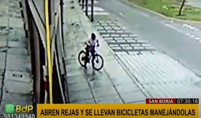 En cuestión de minutos, una banda de ladrones abrió la reja de un condominio en San Borja y se llevó las bicicletas. Inicialmente fueron dos, las que se llevaron manejándolas, pero segundos después llegó otro sujeto y sustrajo una tercera bicicleta.