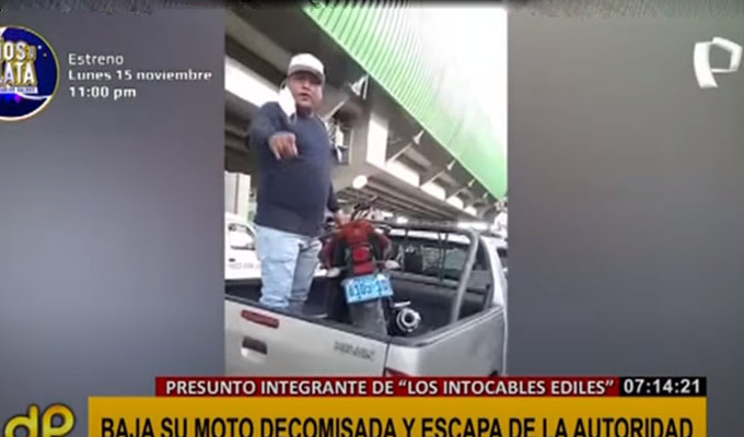 Sin importarle la presencia de un agente policial, Luis Mirko Navarro Salvador sube a la camioneta de Fiscalización de la Municipalidad de San Borja y baja su motocicleta, que minutos antes había sido decomisada por trabajadores ediles.
