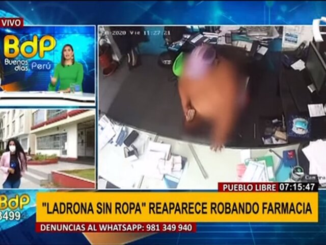 La ‘ladrona desnuda’ reaparece. Cámaras de seguridad captaron a la mujer robando una farmacia ubicada en la cuadra 25 de la avenida Brasil, muy cerca al hospital de Policía, en el distrito de Pueblo Libre.
