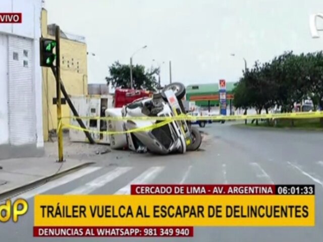 Cercado de Lima: tráiler vuelca tras intentar escapar de presuntos asaltantes