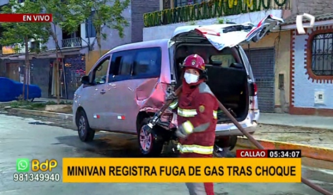 Esta mañana, el choque entre una miniván y un auto, a la altura del cruce de la calle 2 con la avenida colonial, en el Callao, generó la fuga del tanque de gas del primer vehículo. Los bomberos llegaron de inmediato al lugar para atender la emergencia.