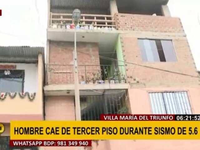 Suceso lamentable. Un hombre de 30 años cayó desde el tercer piso de su vivienda en el distrito de Villa María del Triunfo, durante el sismo de magnitud 5.6 que tuvo como epicentro esta mañana el noroeste de Lima.