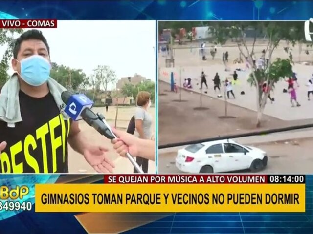 En el distrito de Comas, un gimnasio decidió realizar actividades al aire libre en un parque, a pesar de las quejas de los propios vecinos, quienes no tienen tranquilidad y viven quejándose por el alto volumen de los parlantes. Además, los propios vecinos indican que el parque que han tomado no es lugar para hacer ejercicio.
