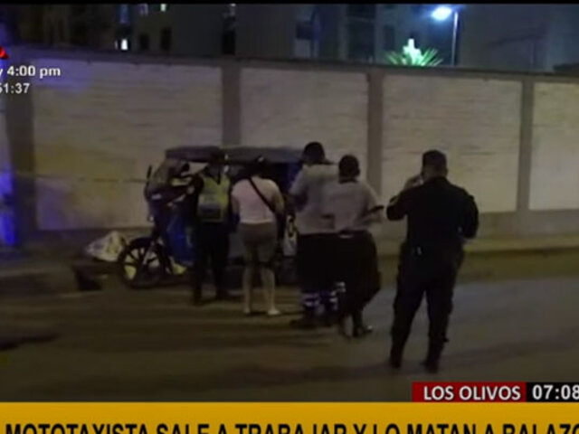 Un mototaxista fue asesinado por dos sicarios en el distrito de Los Olivos. El hecho ocurrió la tarde de ayer en la intersección de las calles Las Peras y Carrizal. La víctima estaba a bordo de su vehículo cuando desconocidos le dispararon directamente en la cabeza.