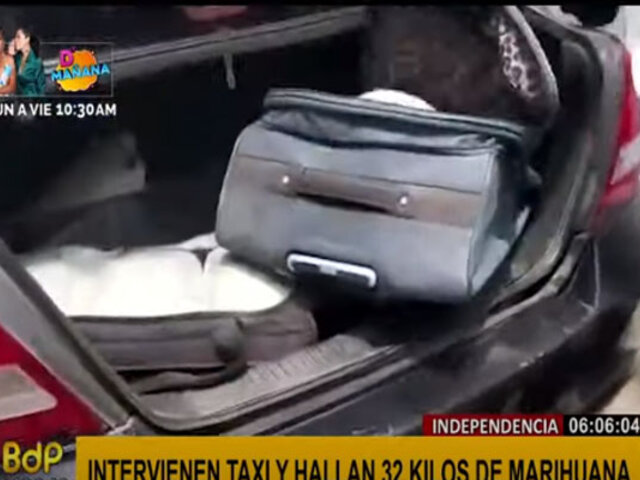 Durante un amplio operativo en el distrito de Independencia, la Policía Nacional intervino un taxi y encontró en la maletera 32 kilos de marihuana. La ilícita mercadería estaba distribuida en paquetes dentro de dos maletas de viaje.