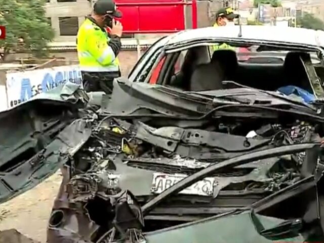 Fatal accidente. Un chofer de un auto murió al impactar contra un bus interprovincial en la vía de Evitamiento a la altura de Puente Nuevo. Tal como registraron las cámaras de Buenos Días Perú, el vehículo de placa ABF 246 quedó totalmente destrozado, con las puertas desprendidas.
