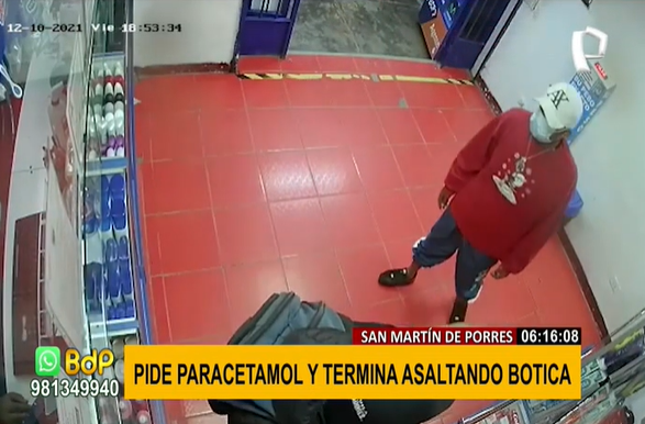Cámaras captaron el preciso instante en que un delincuente ingresa de manera sospechosa a una botica. De inmediato saca un arma y amenaza a uno de los trabajadores mientras le indica al otro que abra la puerta para que su cómplice ingrese al local.