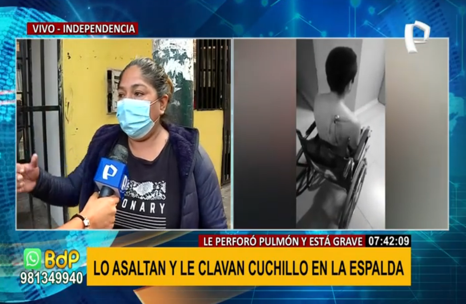 Lamentable. Un joven está grave tras ser apuñalado con un cuchillo por la espalda por un sujeto que lo confundió en medio de una gresca. Este hecho ocurrió en la avenida Los Jazmines, en Independencia. Según dijo la madre, su hijo se encontraba comprando comida cuando recibió el ataque.