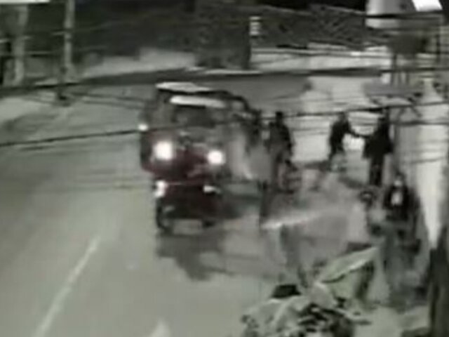 La modalidad de asaltos en manada se han vuelto una constante en el distrito de Villa María del Triunfo. Cámaras de seguridad captaron el momento en que delincuentes a bordo de tres vehículos, descienden de las unidades armados y cierran el paso a dos transeúntes.