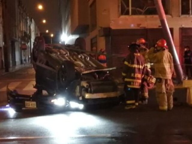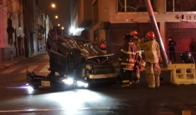 El auto dio varias vueltas de campana hasta terminar volcado con las llantas para arriba debido al fuerte impacto. Los ocupantes se salvaron de morir, mientras que el poste quedó inclinado, a punto de caerse. Efectivos policiales, serenos y bomberos lograron cercar la zona.