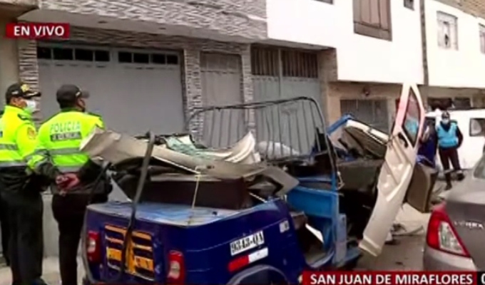 Una mototaxi quedó totalmente destrozada luego de chocar contra una minivan en la avenida La Unión en el distrito de distrito de San Juan de Miraflores. Producto del fatídico accidente, el conductor de la moto falleció.