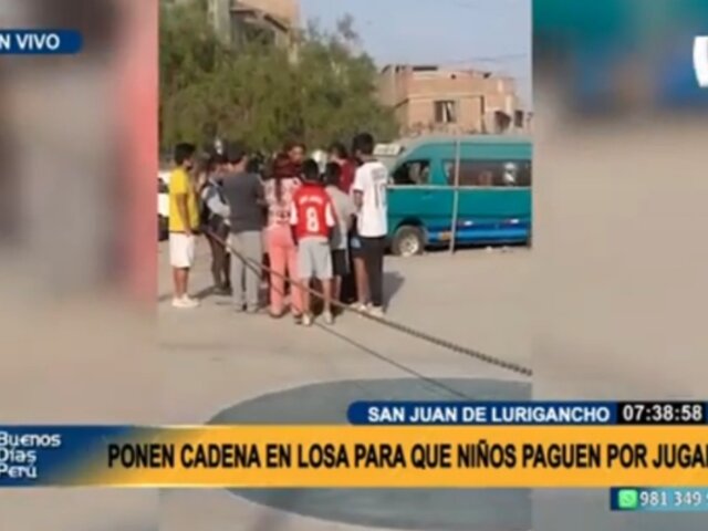 En San Juan de Lurigancho, dos grupos de vecinos están enfrentados por el control de una losa deportiva, perteneciente a la Asociación Simón Bolívar, I etapa, que desde hace un mes tiene una cadena en el ingreso que impide que adultos y niños puedan disfrutar libremente de este espacio público.