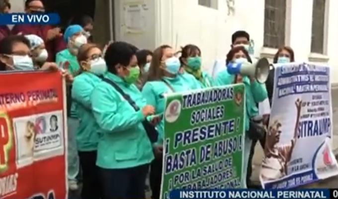 Gremios y sindicatos de trabajadores del Instituto Nacional Materno Perinatal protestan a la autoridades para que resuelvan la problemática de la falta de medicamentos y equipos para la atención de recién nacidos.