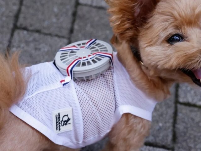 Fabricante de ropa se alió con veterinarios para crear un ventilador portátil para mascotas, a fin de protegerlos de la ola de calor.