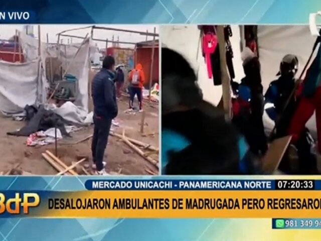 Gran cantidad de comerciantes fueron desalojados del mercado de Unicachi de Comas, ubicado en el cruce de la avenida Panamericana Norte con la avenida Próceres, durante la madrugada de este lunes. Sin embargo, los negociantes volvieron horas después para levantar sus puestos, a pesar de ser retirados por fiscalizadores de la Municipalidad de Lima.