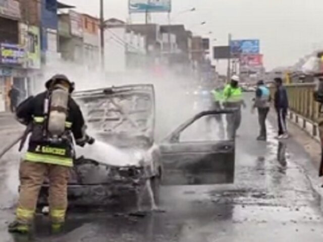 Un auto que funciona a balón de gas se incendió en la avenida Túpac Amaru en el distrito de Independencia. A pesar del peligro que representa una posible explosión, aún hay vehículos transitado por dicha vía.