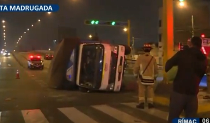 Esta madrugada, un camión terminó volcado entre el cruce del jirón Virú y la avenida Prolongación Tacna en el Rímac. Dos personas viajaban en esta unidad rumbo al Mercado de Flores. Según las primeras informaciones, quien choca al camión lleno de carga fue un taxista fuera de control.