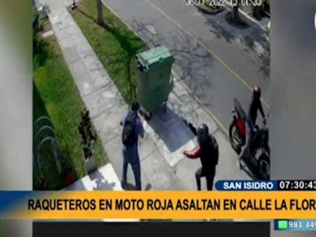 Raqueteros a bordo de una motocicleta han sido captados asaltando de manera frecuente a vecinos del distrito de San Isidro.