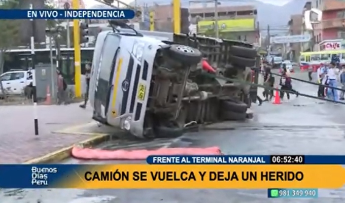 Esta mañana, una furgoneta y un auto impactaron en el cruce de las avenidas Túpac Amaru y Los Alisos, en el distrito de Independencia, frente a la estación Naranjal, dejando a una persona herida. Además, por el choque se produjo derrame de combustible.